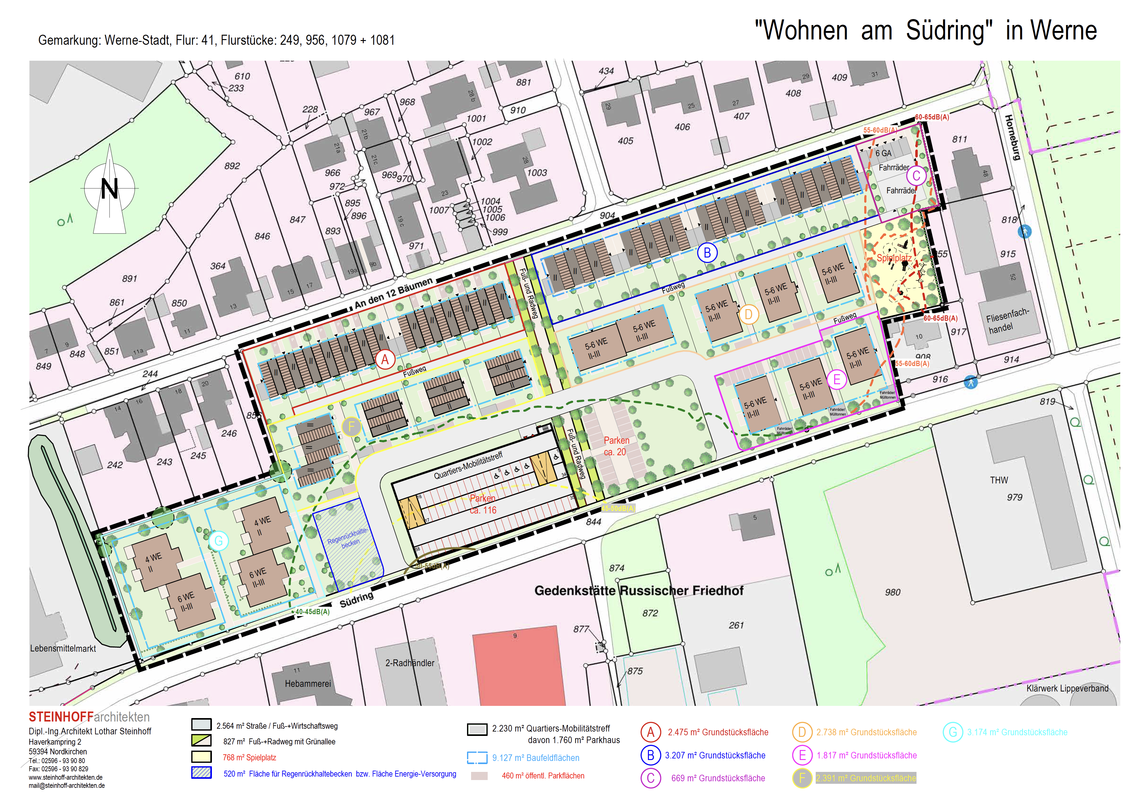 Das Wohnquartier am Südring setzt neue Maßstäbe in Sachen Wohnen. Es bietet 27 Einfamilienhäuser als Reihen- oder Doppelhaushälften und 12 Mehrfamilienhäuser mit insgesamt 94 Wohneinheiten, von denen 30 % öffentlich gefördert sind. Jeder Quadratmeter wurde mit Blick auf Qualität, Nachhaltigkeit und urbane Eingliederung gestaltet.“